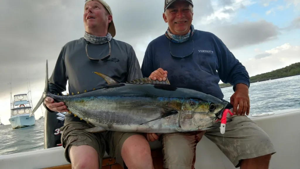 All traditional tuna trolling lures are effective and 30-50lb class tackle is preferred. However, spinning tackle (rated for 50lbs and above) and popping plugs make for the best experience. The tuna are usually found blowing up bait on the surface and stay up long enough for the anglers to cast into them. It can be challenging at times and put even the most experienced angler to the test.